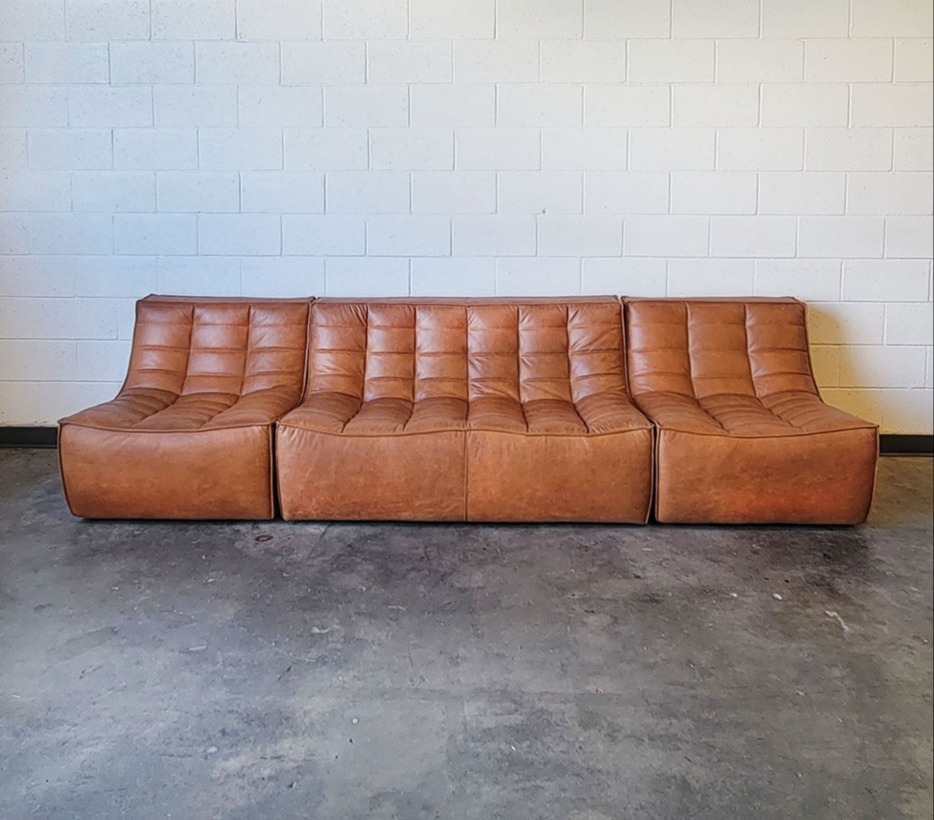 Modular tan leather sectional, includes an armless love seat and 2 armless chairs.